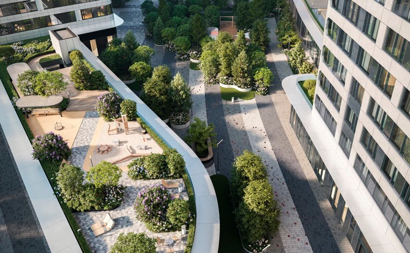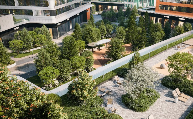 В квартале предусмотрена богатая внутренняя инфраструктура. Общая благоустроенная территория комплекса составляет 6 гектаров, на которой размещены зоны для отдыха, детские и спортивные площадки.