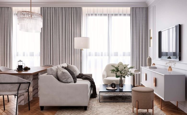 В проекте предложен широкий выбор планировочных решений: от студий до четырехкомнатных квартир площадью 230 кв. метров. В наличии квартиры с большими кухнями-гостиными и мастер-спальнями, оборудованными собственными гардеробными и ванными комнатами. В квартирах спроектированы увеличенные окна, высота которых составляет 2,16 метра, а ширина — до 3 метров. Можно подобрать квартиру как без отделки, так и с отделкой White box.
