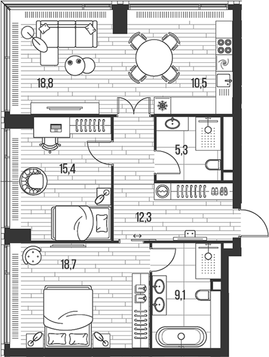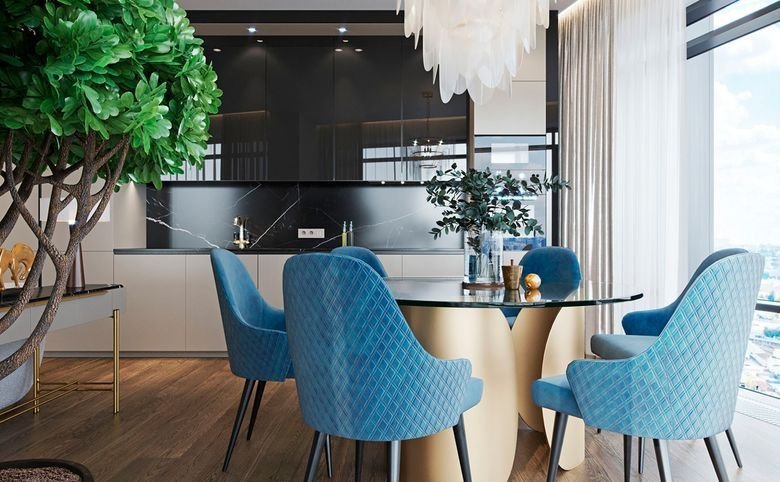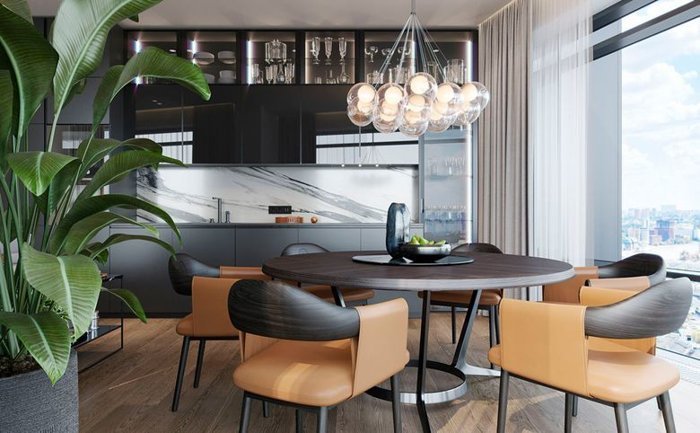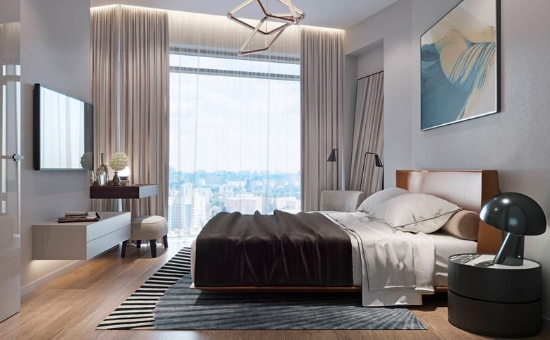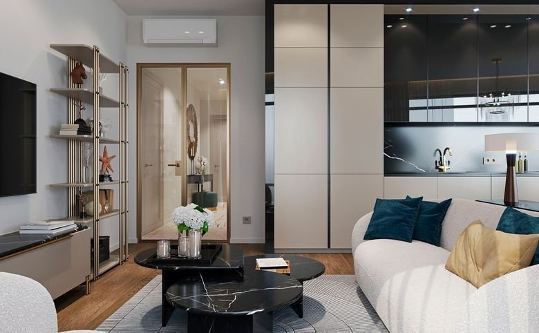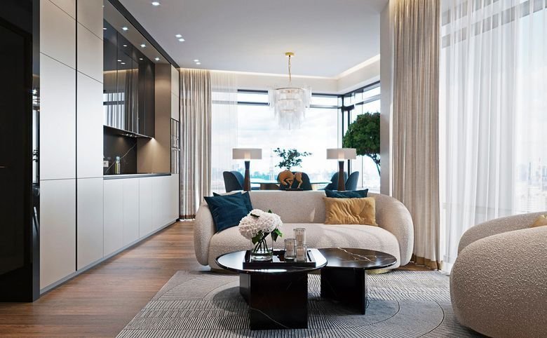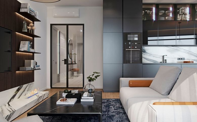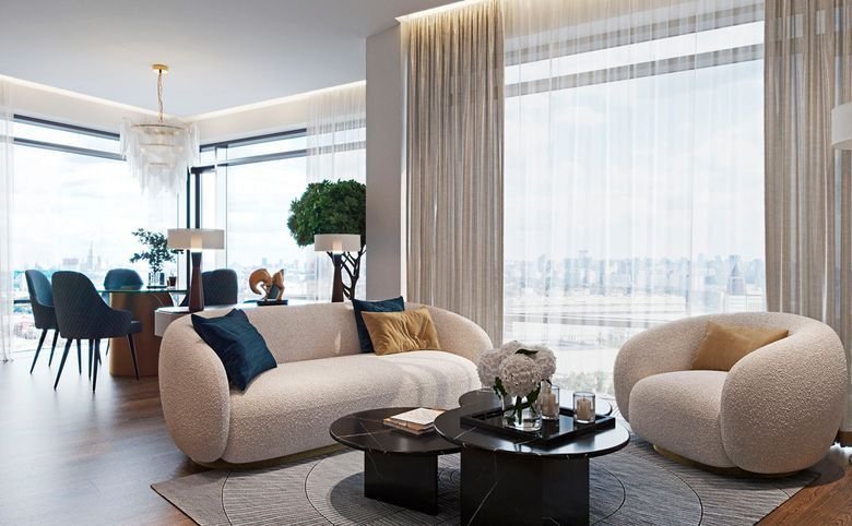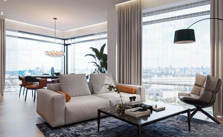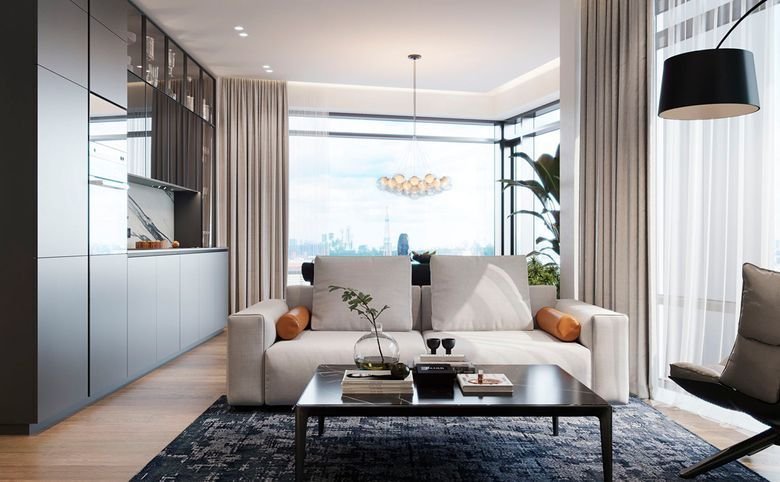 Площадь квартир и пентхаусов в проекте составляет от 36 до 210 кв. метров, а высокие потолки создают атмосферу легкости. Квартиры представлены с панорамными окнами и стеклянными эркерами.