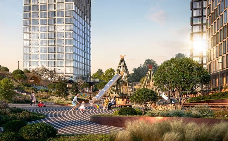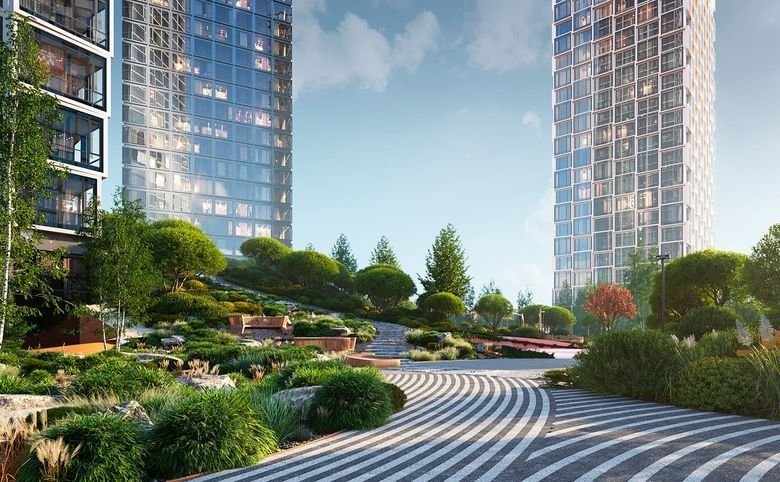 Уникальная особенность проекта — увеличенная площадь озеленения внутреннего пространства. В ЖК спроектирован двухуровневый внутренний двор, в центре проекта разбит сад с интересным рельефом, который украсит парящий пешеходный мост. Здесь расположены детская и спортивные площадки, оборудованы места для отдыха.