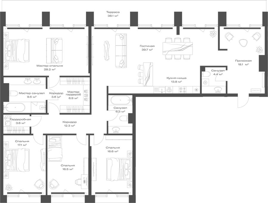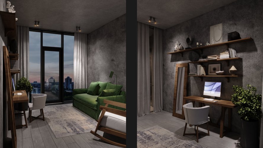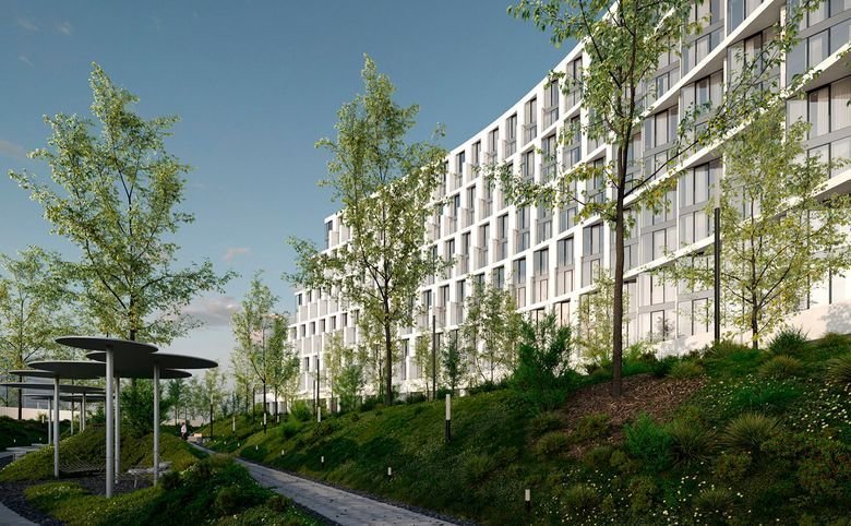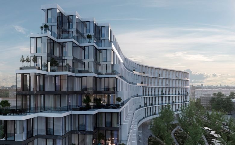 Все квартиры в проекте имеют максимальное остекление с видом на реку, а выступающие пилоны позволяют сохранить приватность. Активный многогранный рельеф позволил архитекторам скомпоновать оконные проёмы таким образом, чтобы виды на набережную открывались почти из всех квартир комплекса. Уникальные квартиры с 8 балконами на разные стороны света, не менее эффектные решения — кабинеты и гардеробные с отдельными балконами, а ванные комнаты с панорамными окнами и собственным балконом.