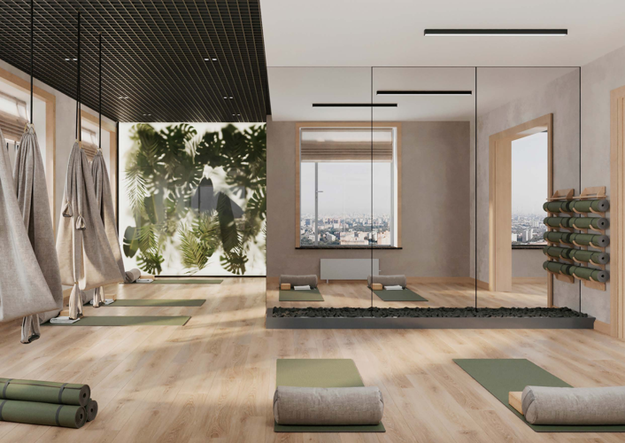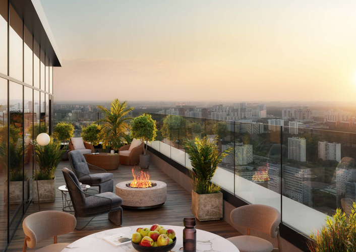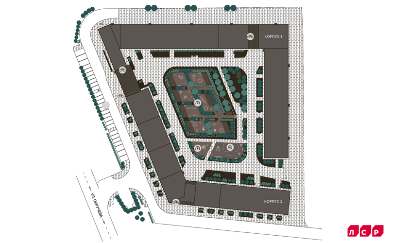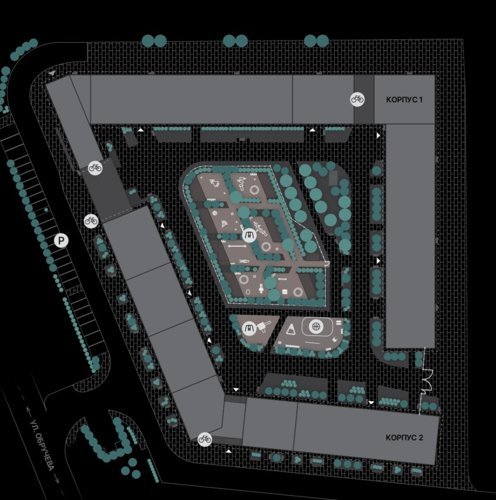 На территории комплекса: закрытый от автомобилей двор со спортивными и детскими площадками, навесами для отдыха и малыми архитектурными формами. Внутри двора для жильцов есть Wi-Fi, скамейки с устройствами для зарядки мобильных телефонов.